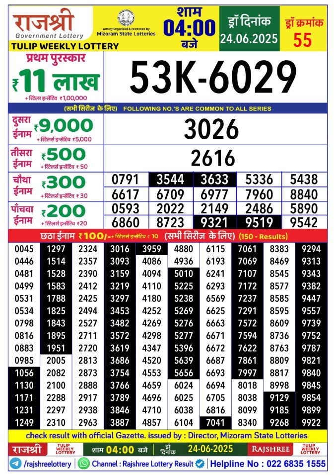 Rajshree tulip Tuesday Weekly Lottery 4PM Result 24.06.2025