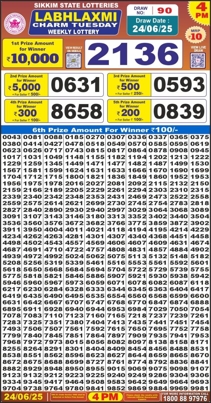 Dear 10 green lottery 1.30PM Result 24.06.2025