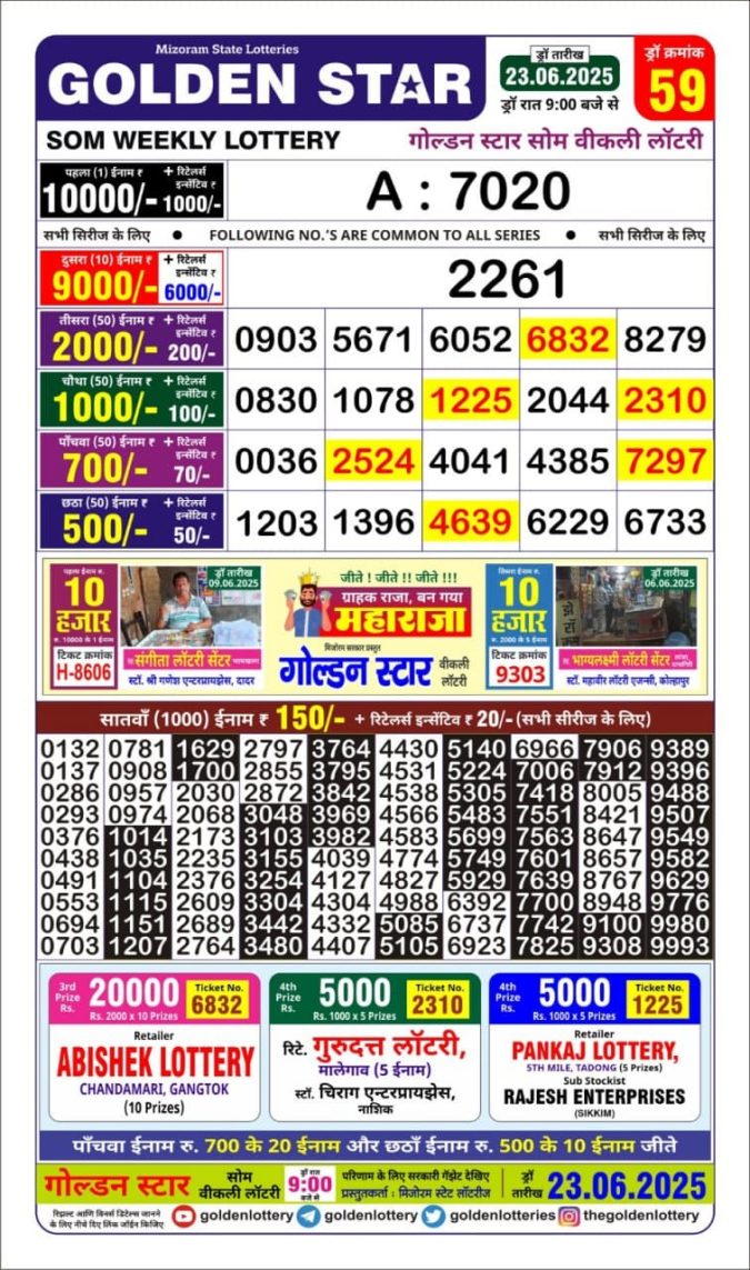Golden Star weekly Lottery result 9pm 23.06.2025