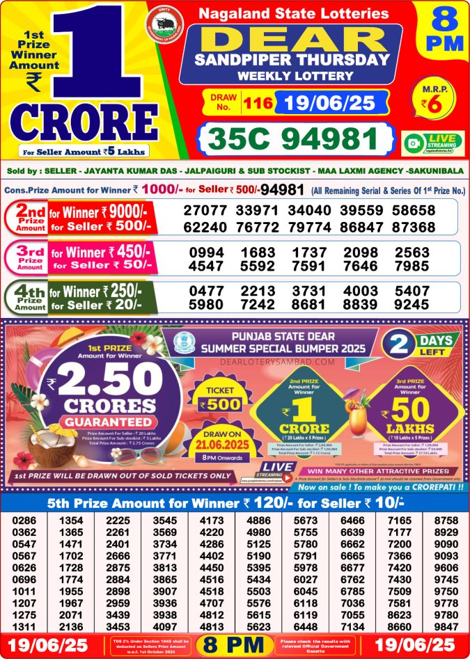 Dear Sandpiper Thursday Weekly Lottery 8PM Result 19.06.2025