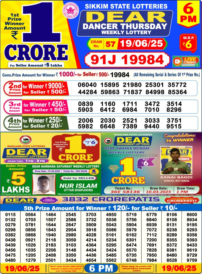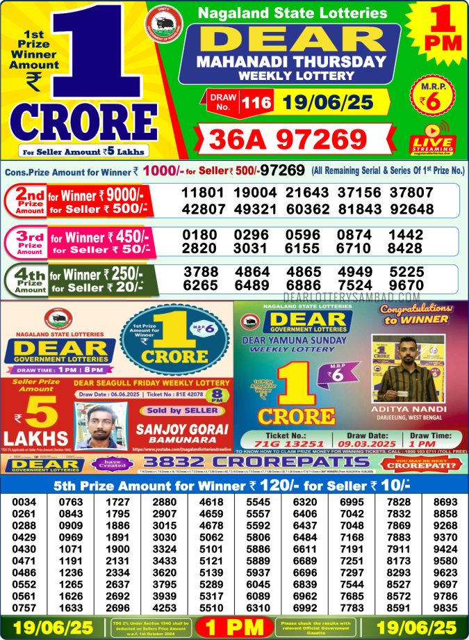 Dear mahanadi Thursday Weekly 1pm result 19.06.2025
