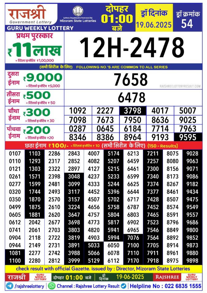 Rajshree Guru Thursday Weekly Lottery 1PM Result 19.06.2025