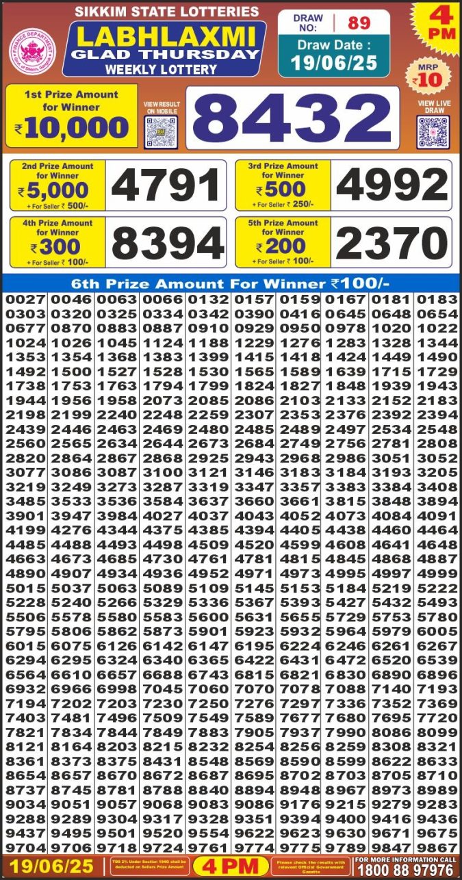 Labh Laxmi Glad weekly 4PM Result 19.06.2025