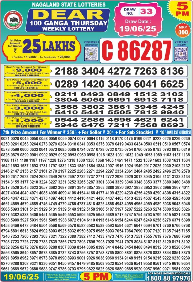 Dear 100 Ganga Thursday Lottery 5pm Result  19.06.2025