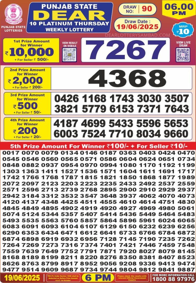 Punjab state dear 10 6pm lottery result 19.06.2025