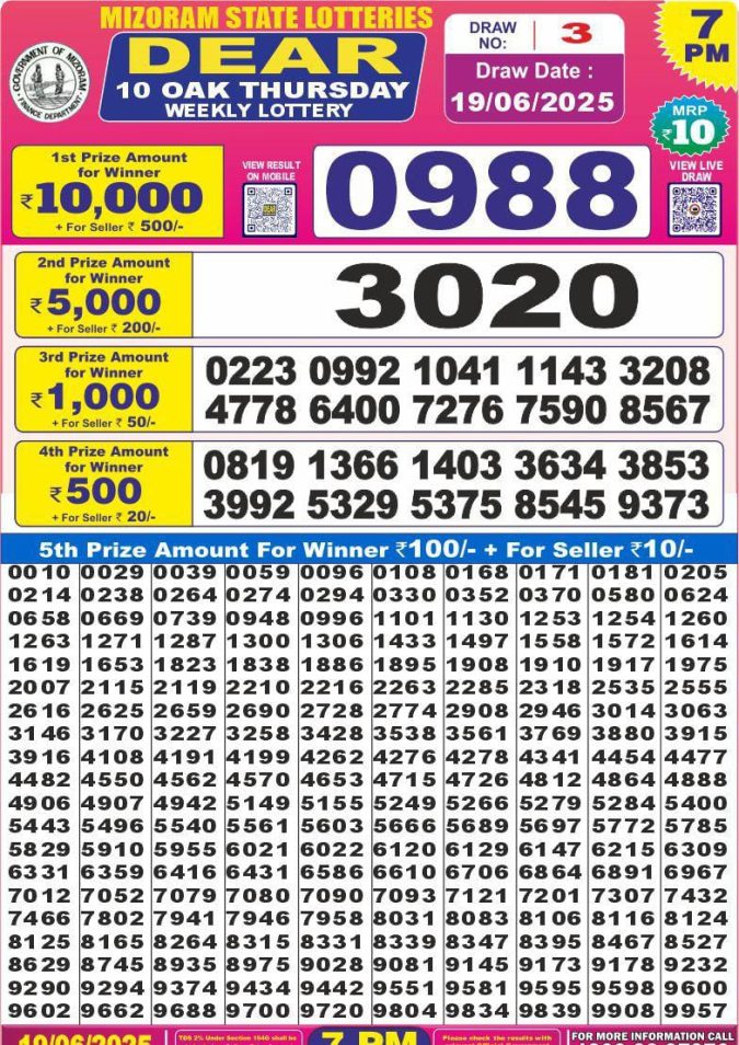 Dear 10 pink lottery 1.30PM Result 19.06.2025