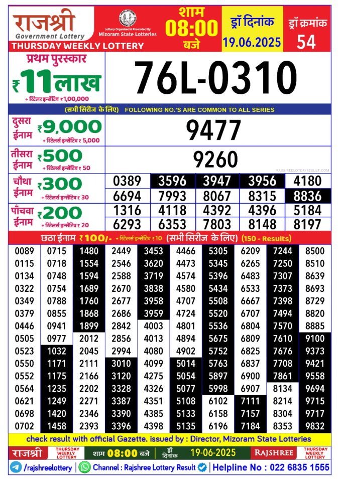 Rajshree Thursday Weekly Lottery 8PM Result 19.06.2025