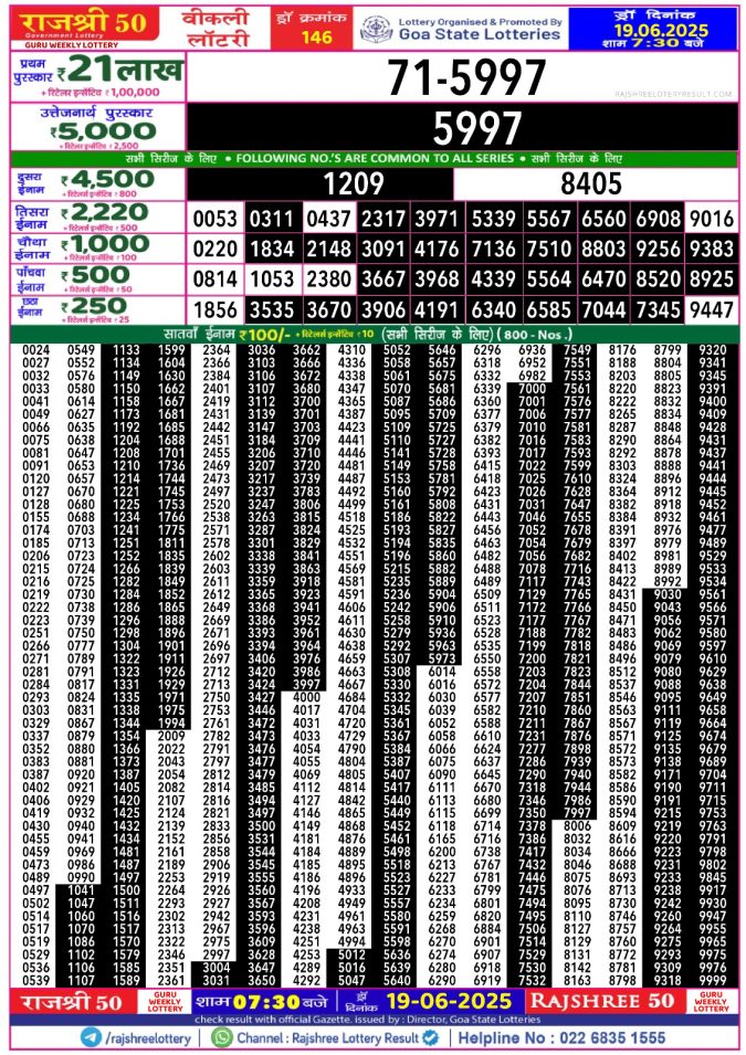 Rajshree 50 Lottery 7:30PM Result 19.06.2025