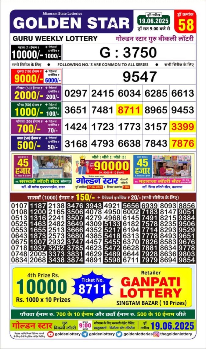 Golden Star weekly Lottery result 9pm 19.06.2025