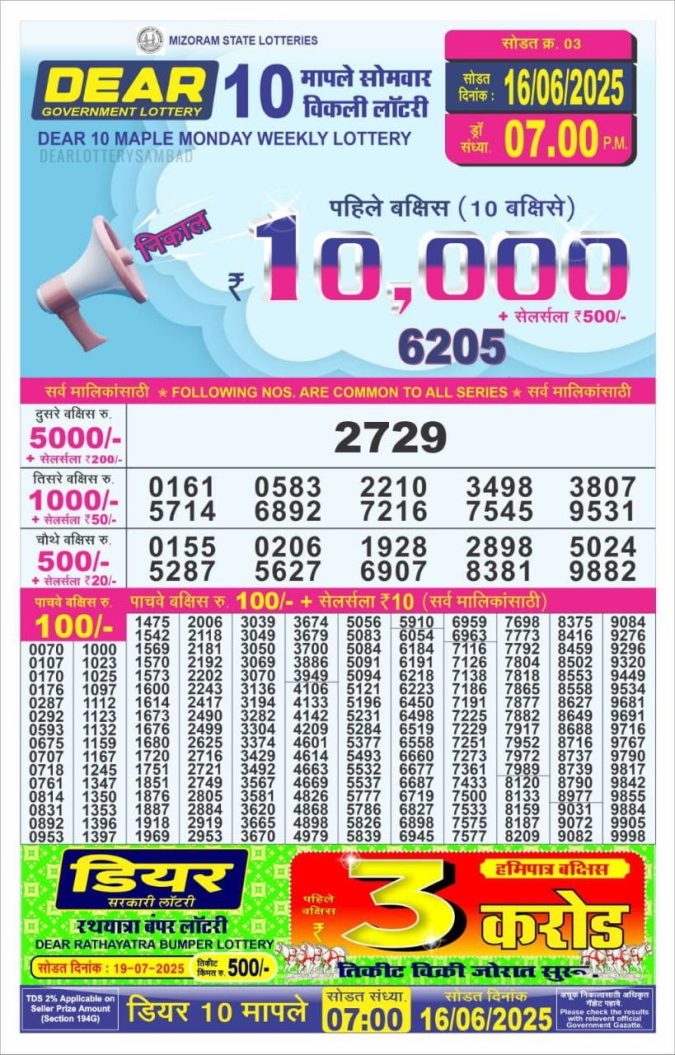 Punjab state dear 10 6pm lottery result 16.06.2025