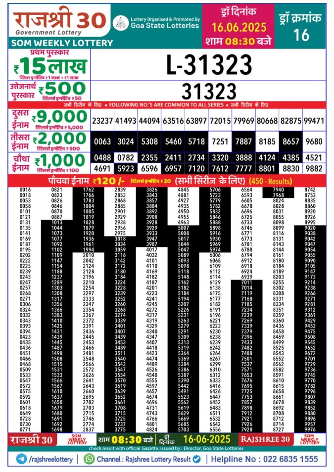 Rajshree 30 Lottery 8:30PM Result 16.06.2025