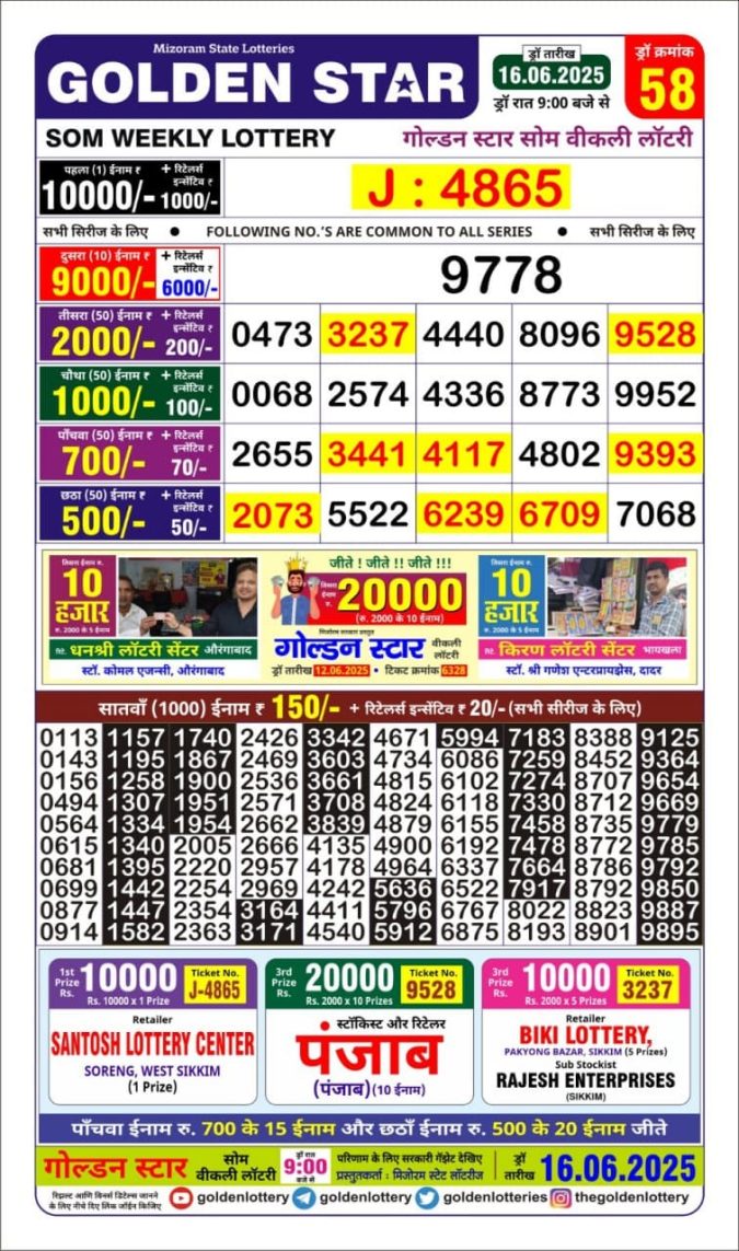 Golden Star weekly Lottery result 9pm 16.06.2025