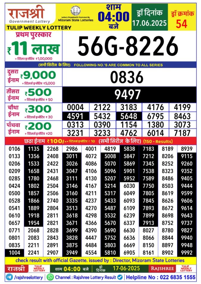 Rajshree tulip Tuesday Weekly Lottery 4PM Result 17.06.2025