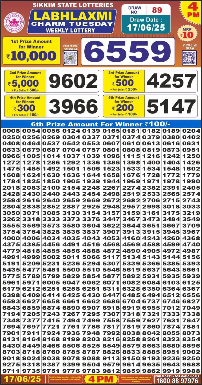 Dear 10 green lottery 1.30PM Result 17.06.2025