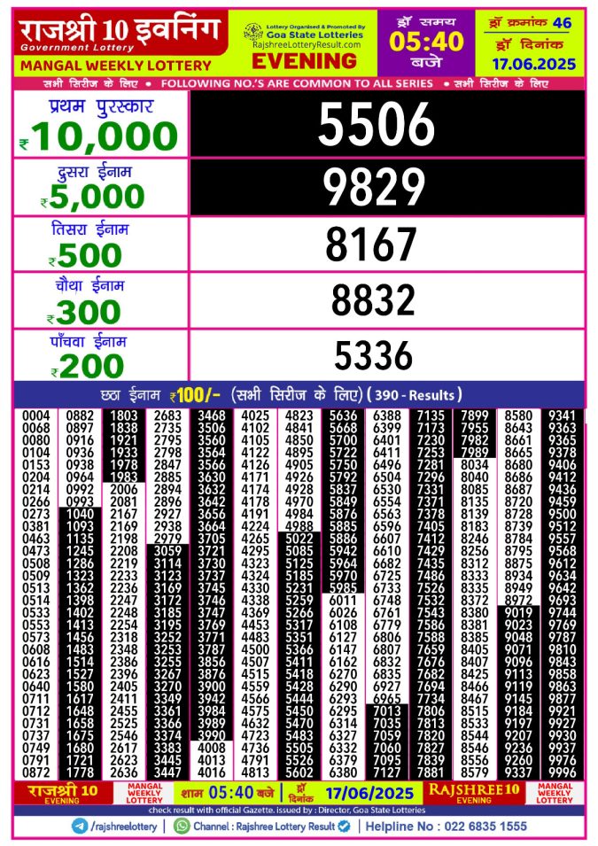 Rajshree 10 evening tuesday 5:40pm result 17.06.2025