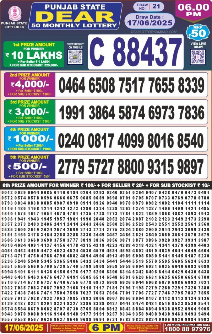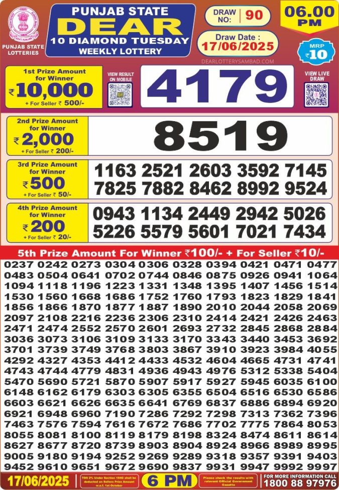 Punjab state dear 10 6pm lottery result 17.06.2025