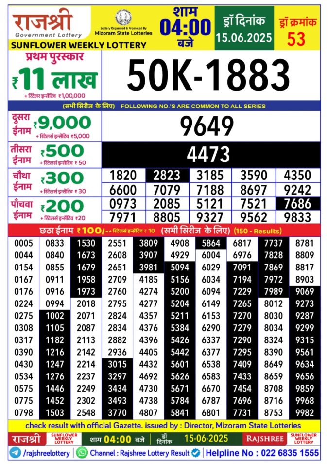 Rajshree sunflower sunday Weekly Lottery 4PM Result 15.06.2025