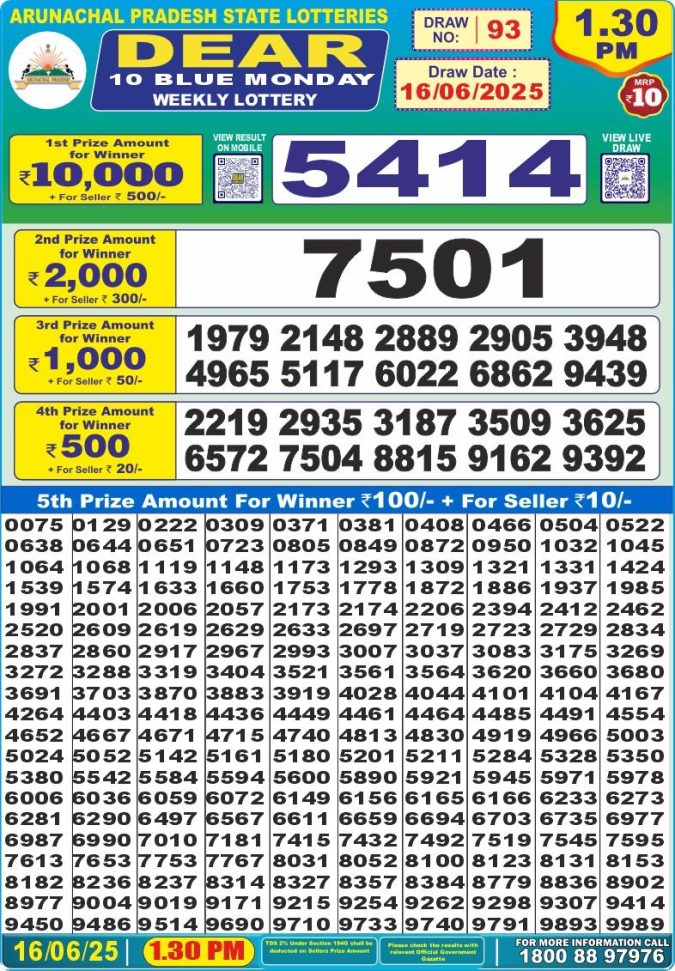 Dear 10 blue lottery 1.30PM Result 16.06.2025