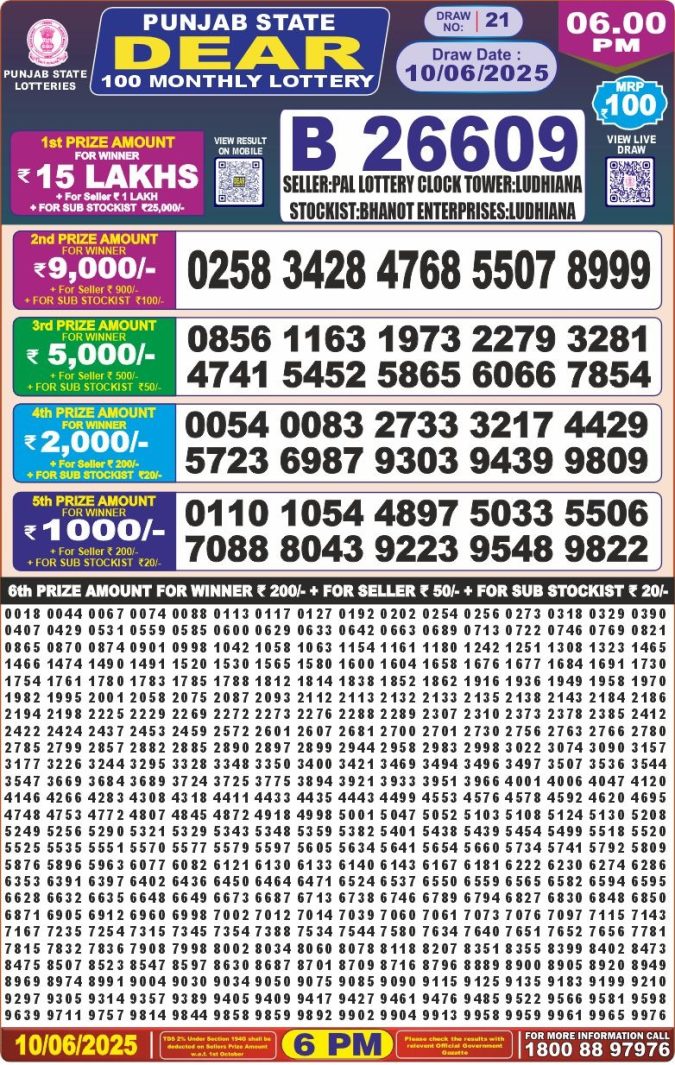 Punjab state dear 100 monthly lottery result 10.06.2025
