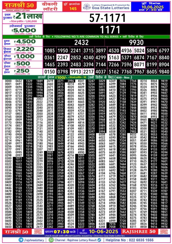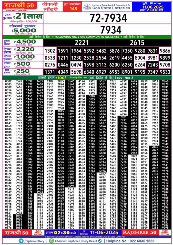 Rajshree 50 Lottery 7:30PM Result 10.06.2025