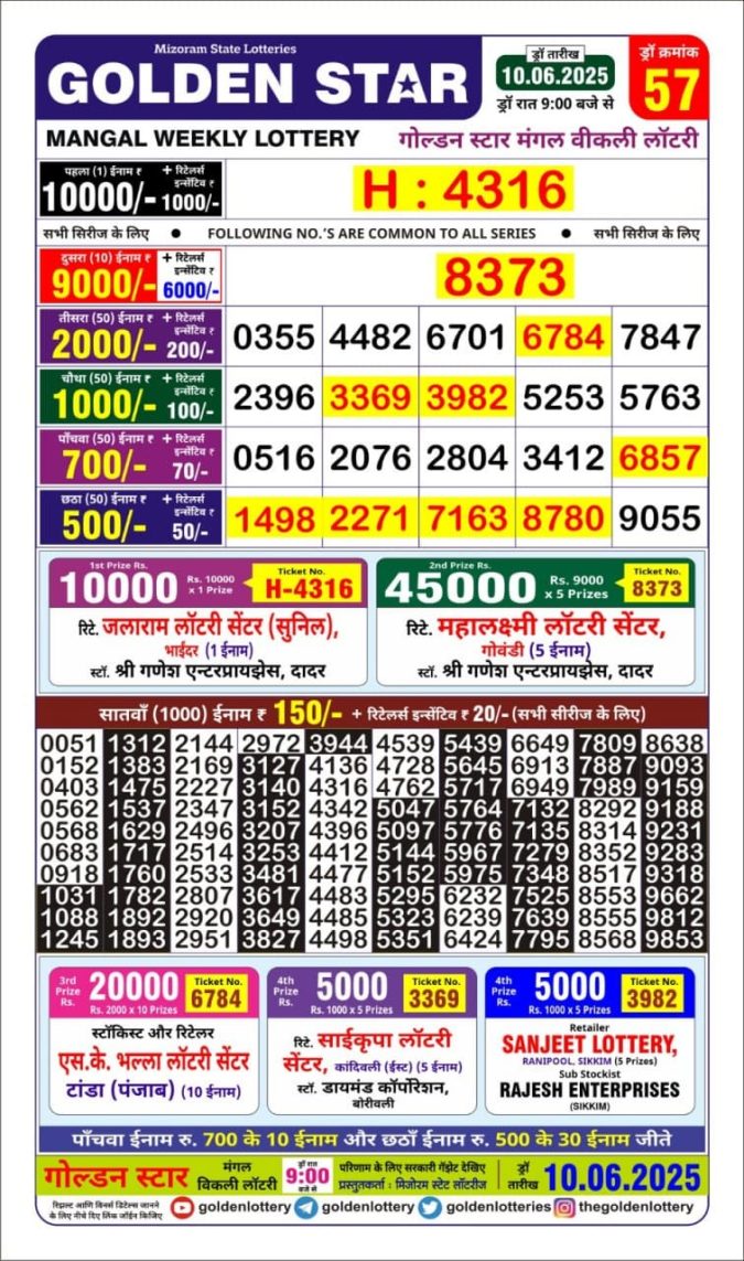 Golden Star weekly Lottery result 9pm 10.06.2025