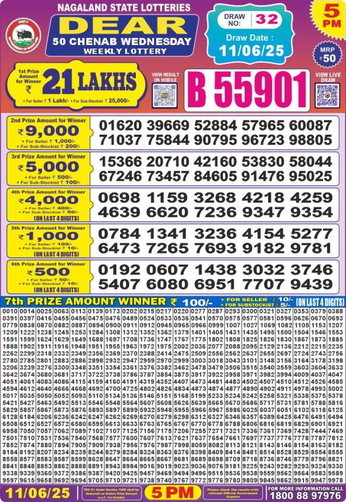 Dear 50 Chenab 5pm Wednesday Lottery Result 11.06.2025