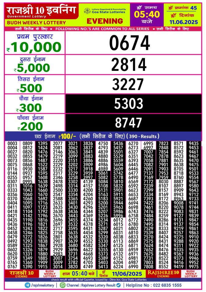 Rajshree 10 evening Wednesday 5:40pm Lottery result 11.06.2025