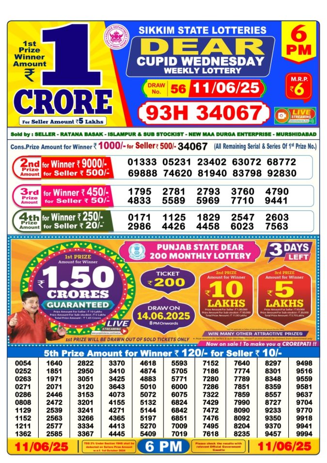Dear cupid wednesday weekly Lottery 6PM Result 11.06.2025