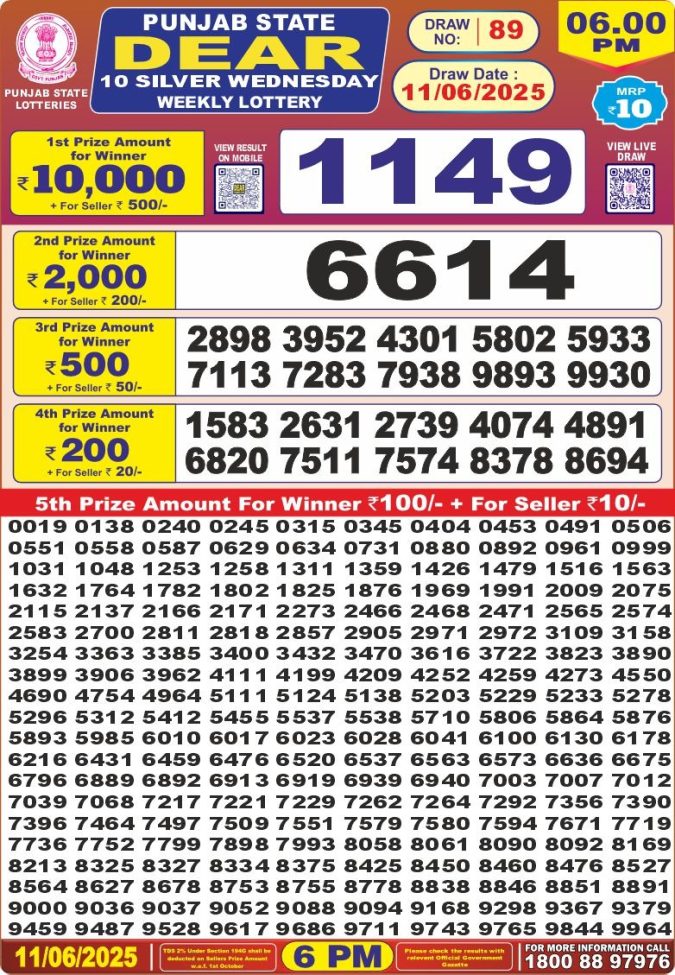 Punjab state dear 10 6pm lottery result 11.06.2025