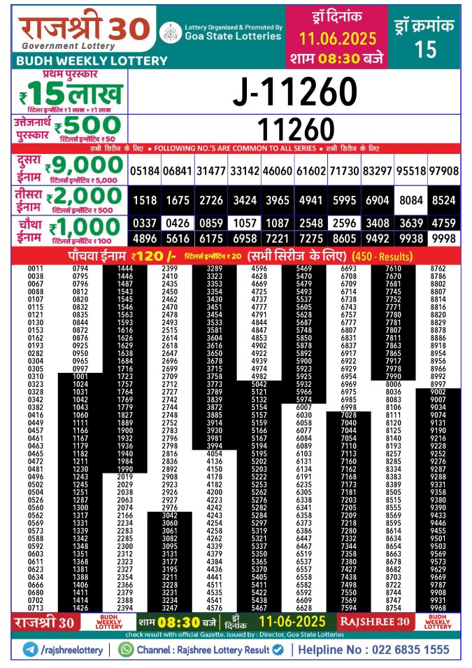 Rajshree Budh Weekly Lottery 1PM Result 11.06.2025