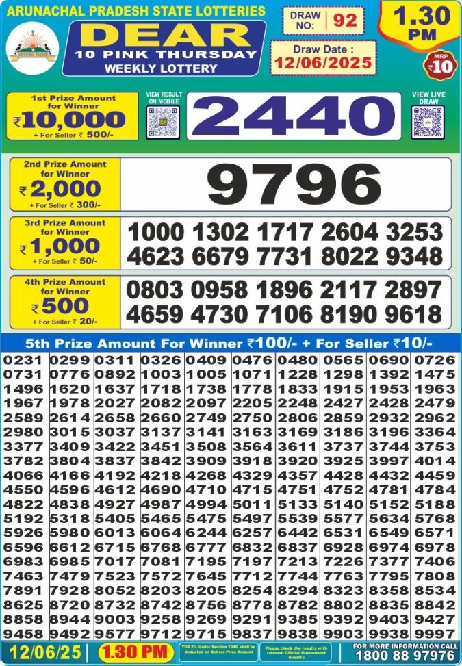 Dear 10 pink lottery 1.30PM Result 12.06.2025