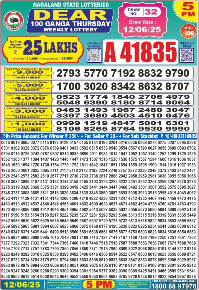 Dear 100 Ganga Thursday Lottery 5pm Result  12.06.2025