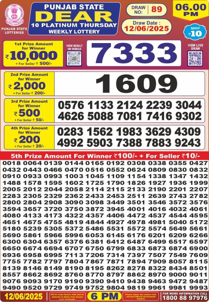 Punjab state dear 10 6pm lottery result 12.06.2025