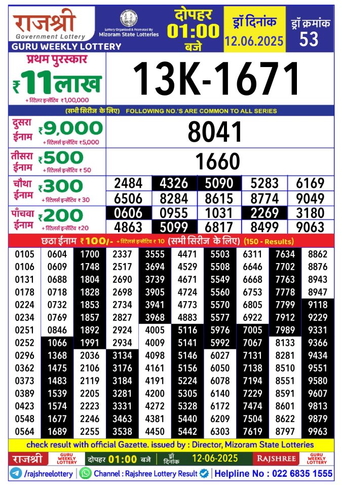 Rajshree Guru Thursday Weekly Lottery 1PM Result 12.06.2025