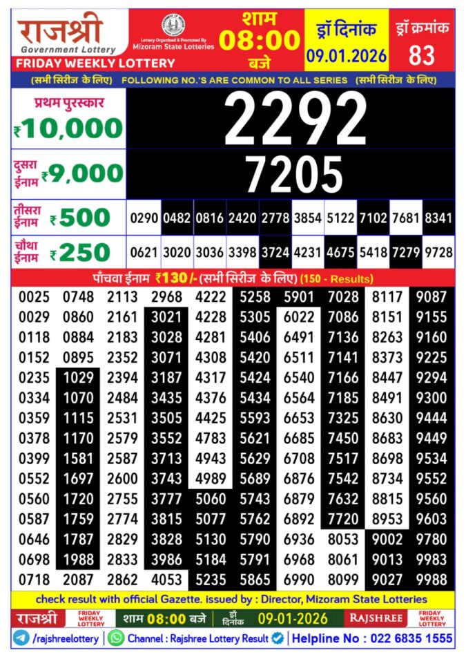 Rajshree Shukra Weekly Lottery 1pm Result 09.01.2026