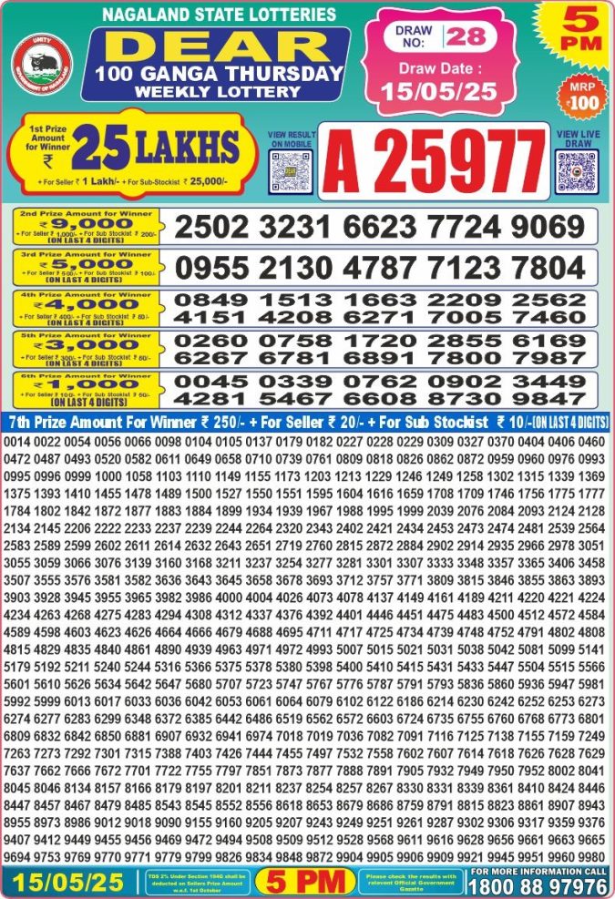 Dear 100 Ganga Thursday Lottery 5pm Result  15.5.2025