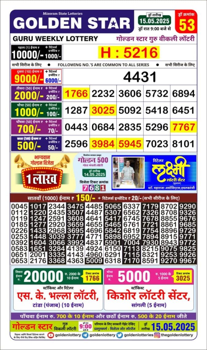 Golden Star weekly Lottery result 9pm 15.5.2025