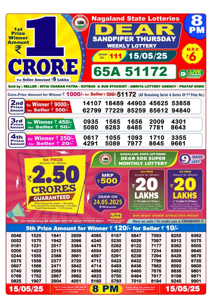 Dear Sandpiper Thursday Weekly Lottery 8PM Result 15.5.2025