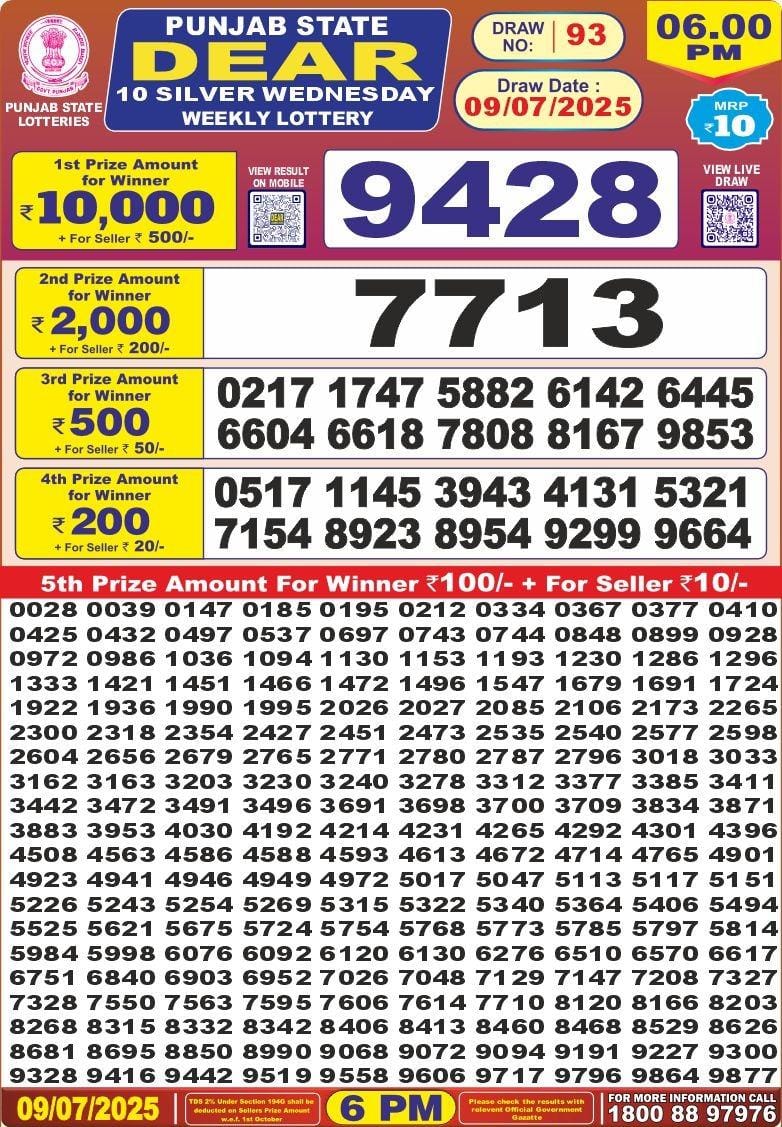 Punjab state dear 10 6pm lottery result 09.07.2025