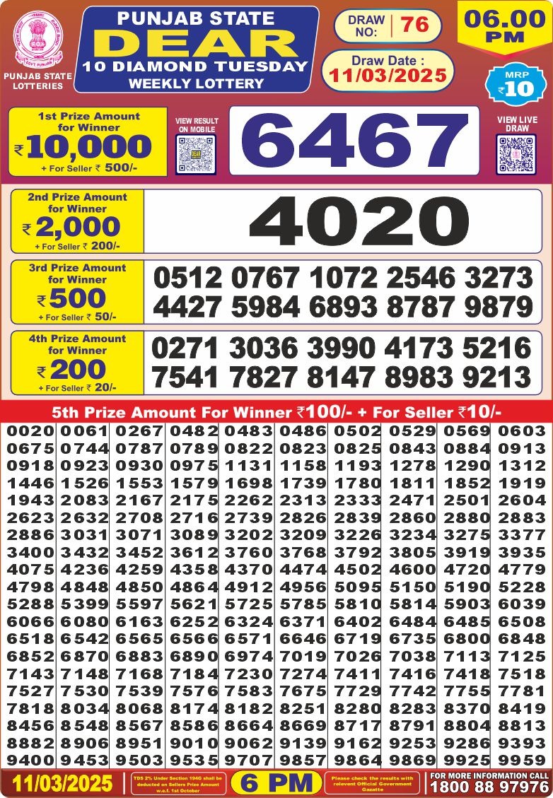 Punjab state dear 10 6pm lottery result 11.3.25