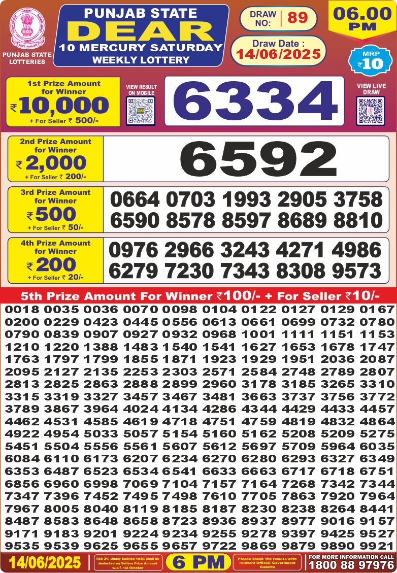 Punjab state dear 10 6pm lottery result 14.06.2025