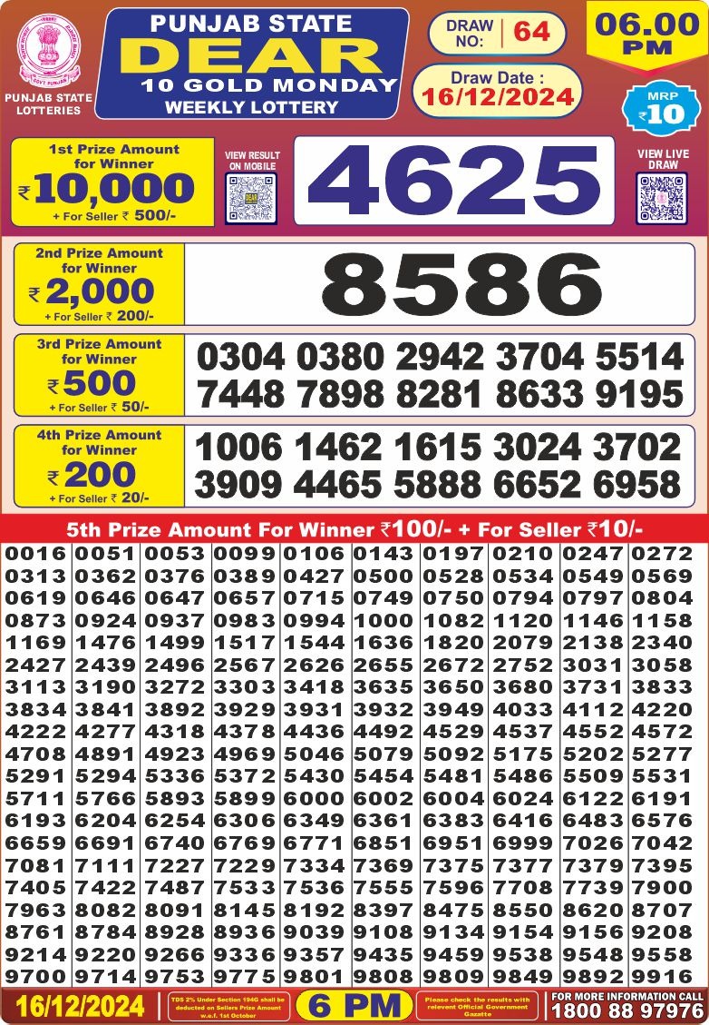 Punjab state dear 10 6pm lottery result 16.12.24