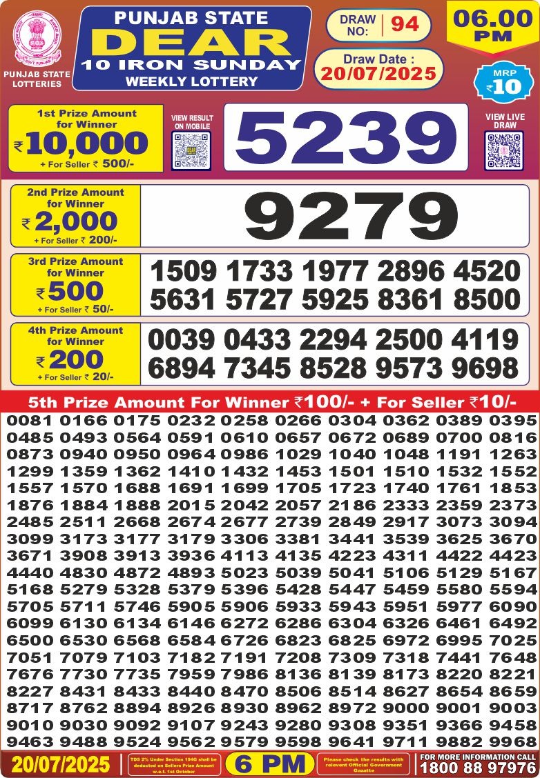 Punjab state dear 10 6pm lottery result 20.07.2025