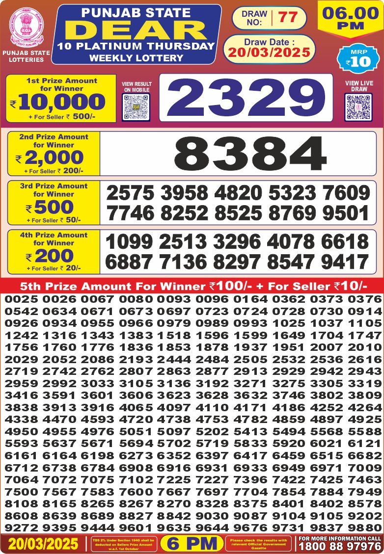 Nagaland State Lotteries was established in the year 1972 under the supervision of the Finance Department to generate a dependable source of revenue for the State Government. Nagaland State Lottery is held every day of the week at three different times of the day, Morning, Day, and Evening. Every day, the lottery is held under a different name with some difference in the prize money with the top prize worth ₹1 Crore (including Super Prize amount). The daily lotteries hosted by Nagaland State include Dear Morning Lottery, Dear Day Lottery, and Dear Evening Lottery which costs 6 Rupees for each ticket.