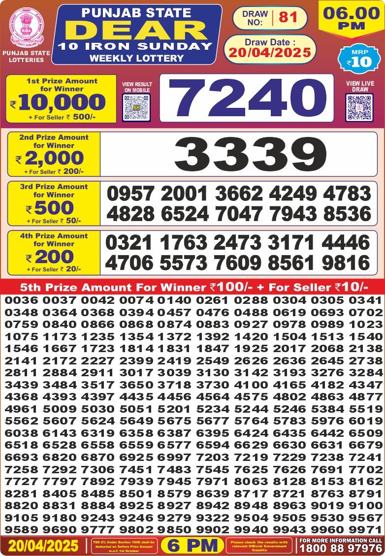 Punjab state dear 10 6pm lottery result 20.4.25