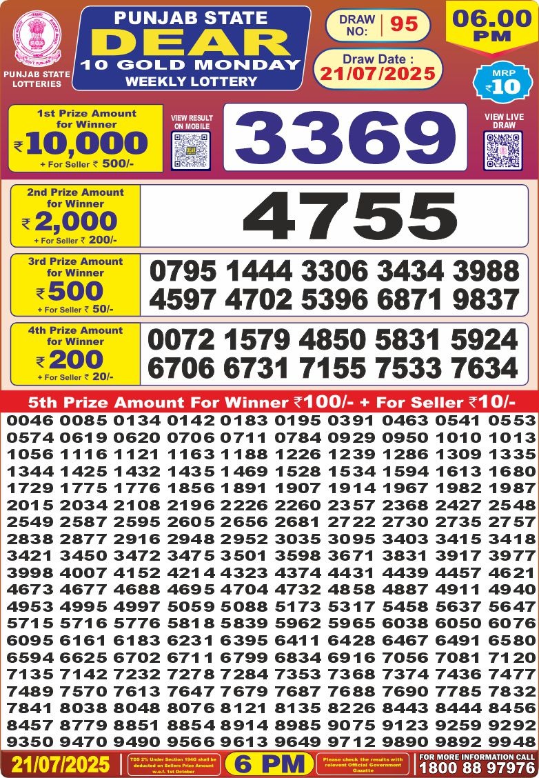 Punjab state dear 10 6pm lottery result 21.07.2025