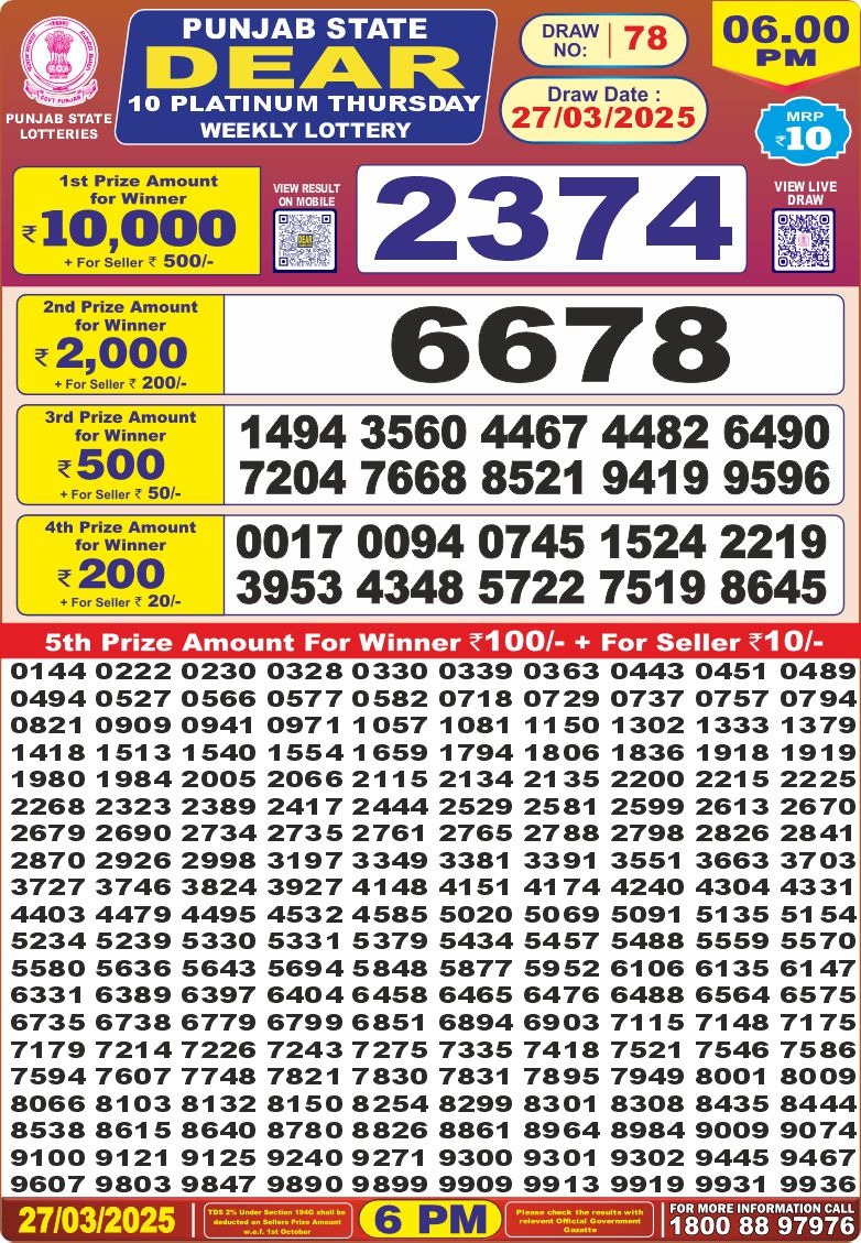 Nagaland State Lotteries was established in the year 1972 under the supervision of the Finance Department to generate a dependable source of revenue for the State Government. Nagaland State Lottery is held every day of the week at three different times of the day, Morning, Day, and Evening. Every day, the lottery is held under a different name with some difference in the prize money with the top prize worth ₹1 Crore (including Super Prize amount). The daily lotteries hosted by Nagaland State include Dear Morning Lottery, Dear Day Lottery, and Dear Evening Lottery which costs 6 Rupees for each ticket.