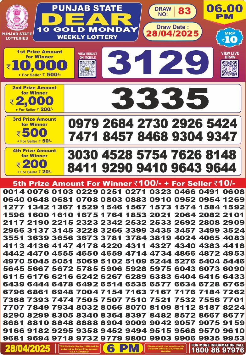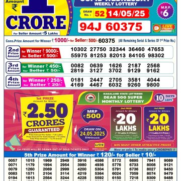 Nagaland State Lotteries was established in the year 1972 under the supervision of the Finance Department to generate a dependable source of revenue for the State Government. Nagaland State Lottery is held every day of the week at three different times of the day, Morning, Day, and Evening. Every day, the lottery is held under a different name with some difference in the prize money with the top prize worth ₹1 Crore (including Super Prize amount). The daily lotteries hosted by Nagaland State include Dear Morning Lottery, Dear Day Lottery, and Dear Evening Lottery which costs 6 Rupees for each ticket.