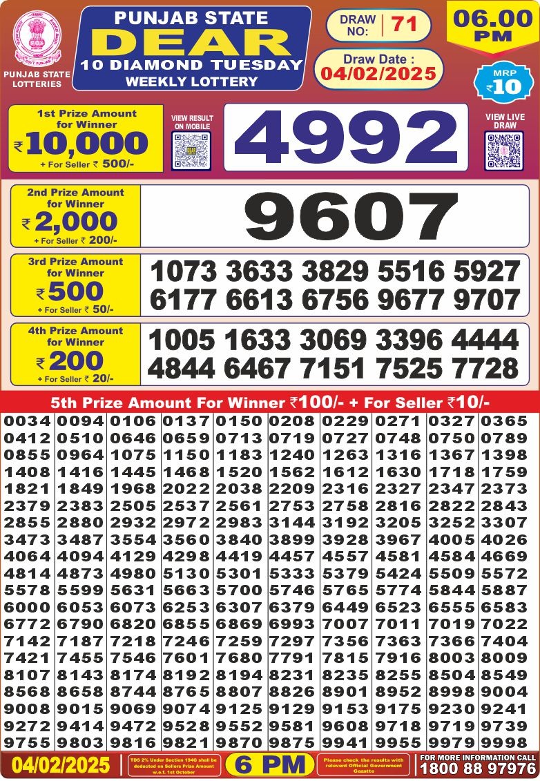 Nagaland State Lotteries was established in the year 1972 under the supervision of the Finance Department to generate a dependable source of revenue for the State Government. Nagaland State Lottery is held every day of the week at three different times of the day, Morning, Day, and Evening. Every day, the lottery is held under a different name with some difference in the prize money with the top prize worth ₹1 Crore (including Super Prize amount). The daily lotteries hosted by Nagaland State include Dear Morning Lottery, Dear Day Lottery, and Dear Evening Lottery which costs 6 Rupees for each ticket.