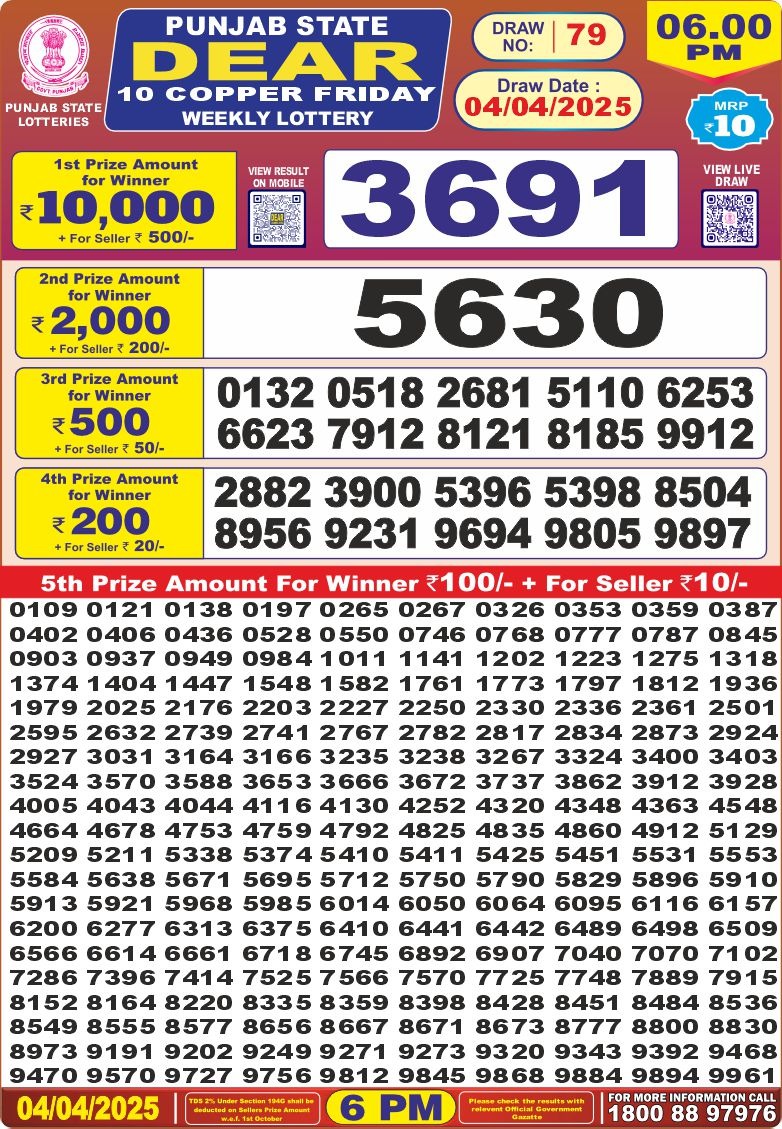 Punjab state dear 10 6pm lottery result 4.4.2025